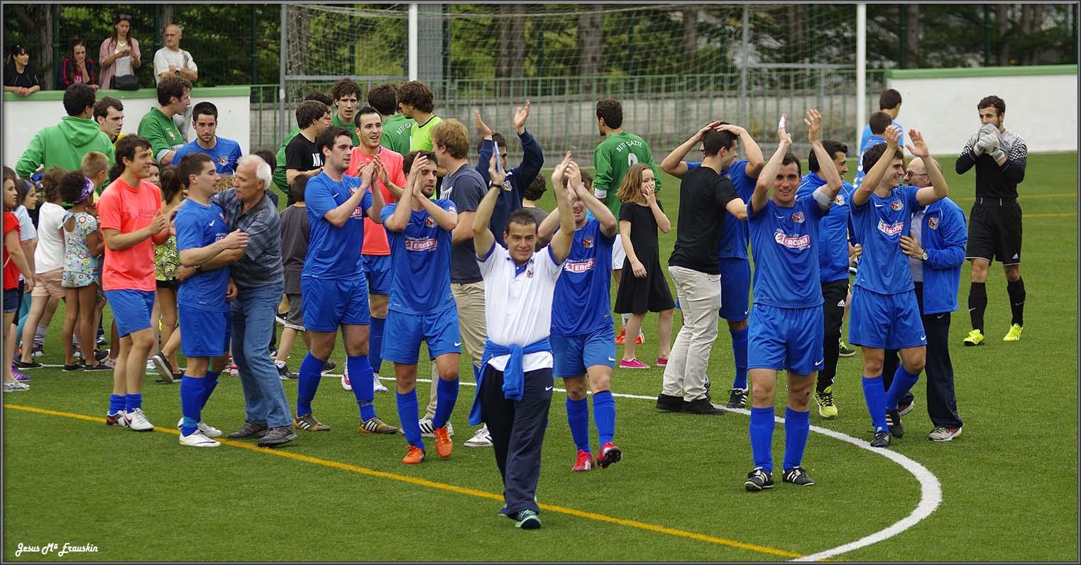 Cuatro equipos jugando para un puesto de descenso en la categoría, más dramático: En el cine. Nosotros éramos uno de ellos, nos la jugábamos en Lesaka contra el Beti Gazte, pero es que ellos también podían tener la desgracia de bajar según como se diesen los demás resultados. Saltamos al campo convencidos y concienciados de lo que había que hacer, ganar. Se apreciaba una “chispa” en las caras de los jugadores, la chispa que debía encender la mecha de la victoria. Comenzó el partido y desde el principio intentamos hacer nuestro juego, tocando y llegando arriba con el balón controlado. Nuestro rival le tiene cogida la medida a su campo y ellos con pases largos se plantaban ante la meta de Pagola. La lucha por el balón era intensa y el Beti Gazte rozaba el límite a la hora de cargar sobre los nuestros en la pugna por el balón. El árbitro dejaba jugar y había momentos de impotencia por nuestra parte. La afición Ordiziarra que se había trasladado hasta Lesaka animaba constantemente, pero ese ánimo no daba sus frutos en el juego, no conseguíamos crear ocasiones claras, aunque el Beti Gazte tampoco nos incomodaba mucho. El partido estaba resultando brusco y tosco. Llegamos al descanso sin goles. En la segunda parte más de lo mismo pero con el inconveniente de que el tiempo se iba agotando, un empate nos podía valer dependiendo de lo que hiciese el Euskalduna, pero había que ganar. Quizás cuando más les estábamos “achuchando” llegó el gol del Beti Gazte. Era el minuto 75, en una contra rápida que hacen por la izquierda nos pillan con la defensa adelantada y nos clavan el cuchillo de la desesperanza en pleno corazón, 1-0. La grada se viene arriba y anima aun más si cabe, quedaban 15 minutos y había que seguir luchando. Sin embargo nuestros jugadores cabizbajos y hundidos iban poco a poco hacia el centro del campo mientras que en la banda izquierda una piña de jugadores rivales entusiasmados celebraban su gol. La “chispa” de sus caras había desaparecido. Claramente tocados se reinicia el juego, en los primeros instantes es el Beti Gazte el que tiene el balón y nosotros corremos detrás. Desde la grada se lanza el mensaje de que el Euskalduna va perdiendo y eso significaba que con un empate nos bastaría. Los jugadores se corren la voz y comienza el cambio, cada balón se lucha como si fuese el último, la afición en la grada anima cada vez más y comenzamos a tener el balón. Minuto 86, Aratz controla de cabeza en la banda izquierda cerca del córner, retrasa para Oskar que centra cerrado al primer palo y aparece Julen Hidalgo entrando con todo, se produce un barullo entre el portero, el poste, el defensa y Julen acabando el balón dentro de la portería rival tras pegarle en la espalda a Hidalgo, 1-1. Difícil de describir, la grada en pie gritando y aplaudiendo, nuestro banquillo saltando al campo, los jugadores rivales con las manos en la cabeza… Se reanuda el juego y todavía somos capaces de correr como si fuese el minuto cinco. Dos minutos más tarde Oskar recibe un balón en la banda izquierda que centra pasado recibiendo Galparsoro, este vuelve a centrar al segundo palo y cuando el portero en su salto parece que la va atrapar con las manos aparece en vuelo “Torza” un metro por encima de todos y cabecea impecable consiguiendo el 1-2. Quedaban dos minutos para el final que se convirtieron en once por los descuentos. Lo que pasó después no lo puedo contar, había que estar en Lesaka para vivirlo. Lo que tantas veces hemos visto en la televisión lo vivimos en primera persona con nuestro equipo. Hubo abrazos, euforia, lágrimas, invasión de campo, felicitaciones entre la afición y miedo entre nuestros rivales porque tuvieron que esperar unos minutos hasta saber que ellos también se salvaban del descenso. Parecía un milagro, pero no nos equivoquemos, no lo fue. Fue tesón, ilusión, esperanza, trabajo, fe, amistad, etc, etc. Si un día estuvimos caídos porque la fortuna nos abandonó incluso habiendo hecho bien las cosas, hoy se puede decir que fuimos capaces de levantarnos para seguir luchando. Al final y solo al final el trabajo realizado ha dado sus frutos y es que el fútbol a veces… es justo. ZORIONAK eta ESKERRIK ASKO. Para ver las fotografías del partido, hacer “clic” en la imagen.