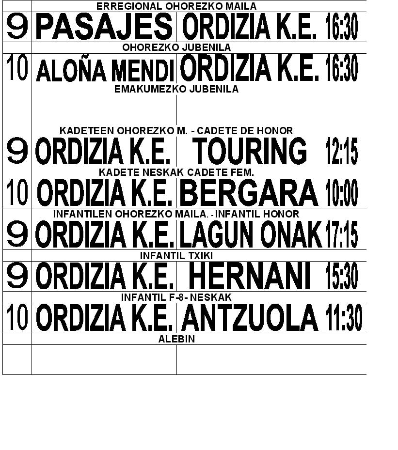 CADETE CADETE DE HONOR COPA Grupo: 1 Jornada: 17 ORDIZIA K.E. - TOURING C.D. Fecha: 09/04/2011 12:15 Campo: ALTAMIRA-anexo (H.A.) INFANTIL INFANTIL HONOR COPA Grupo: 2 Jornada: 18 ORDIZIA K.E. - LAGUN ONAK C.D. Fecha: 09/04/2011 17:15 Campo: ALTAMIRA-anexo (H.A.) INFANTIL INFANTIL TXIKI FASE DE CAMPEONES Grupo: 1 Jornada: 19 ORDIZIA K.E. - HERNANI C.D. Fecha: 09/04/2011 15:30 Campo: ALTAMIRA-anexo (H.A.) AFICIONADO DIVISION DE HONOR REGIONAL Grupo: 1 Jornada: 29 PASAJES C.D. - ORDIZIA K.E. Fecha: 09/04/2011 16:30 Campo: DON BOSCO (H. Artificial) JUVENIL JUVENIL DE HONOR FASE ASCENSO Grupo: 1 Jornada: 17 ALOÑA MENDI K.E. - ORDIZIA K.E. Fecha: 10/04/2011 16:30 Campo: AZKOAGAIN (H.Artificial) FEMENINO FEMENINO CADETE F-11 COPA Grupo: 2 Jornada: 11 ORDIZIA K.E. - BERGARA K.E. Fecha: 10/04/2011 10:00 Campo: ALTAMIRA-anexo (H.A.) FEMENINO INFAMTIL F-8 ORDIZIA K.E. - ANTZUOLA dATA : 10/04/2011 11:30 cAMPO: ALTAMIRA - anexo