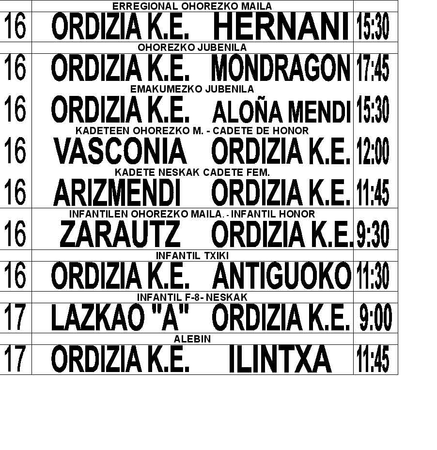 CADETE CADETE DE HONOR COPA Grupo: 1 Jornada: 18 VASCONIA C.D. - ORDIZIA K.E. Fecha: 16/04/2011 12:00 Campo: PUIO (H.Artificial) INFANTIL INFANTIL HONOR COPA Grupo: 2 Jornada: 19 ZARAUTZ K.E. - ORDIZIA K.E. Fecha: 16/04/2011 09:30 Campo: ASTI - TXIKI (H.Artificial) INFANTIL INFANTIL TXIKI FASE DE CAMPEONES Grupo: 1 Jornada: 20 ORDIZIA K.E. - ANTIGUOKO K.E. Fecha: 16/04/2011 11:30 Campo: ALTAMIRA-anexo (H.A.) ALEVIN ALEVIN COPA Grupo: 3 Jornada: 9 ORDIZIA K.E. - ILINTXA S.D. Fecha: 17/04/2011 11:45 Campo: ALTAMIRA-anexo (H.A.) AFICIONADO DIVISION DE HONOR REGIONAL Grupo: 1 Jornada: 30 ORDIZIA K.E. - HERNANI C.D. Fecha: 16/04/2011 15:30 Campo: ALTAMIRA (H.Artificial) JUVENIL JUVENIL DE HONOR FASE ASCENSO Grupo: 1 Jornada: 18 ORDIZIA K.E. - MONDRAGON C.F. Fecha: 16/04/2011 17:45 Campo: ALTAMIRA (H.Artificial) FEMENINO FEMENINO JUVENIL F-11 COPA Grupo: 1 Jornada: 13 ORDIZIA K.E. - ALOÑA MENDI K.E. Fecha: 16/04/2011 15:30 Campo: ALTAMIRA-anexo (H.A.) FEMENINO FEMENINO CADETE F-11 COPA Grupo: 2 Jornada: 12 ARIZMENDI K.E. - ORDIZIA K.E. Fecha: 16/04/2011 11:45 Campo: ALMEN (Gravilla) FEMENINO INFANTIL F-8 LAZKAO "A" - ORDIZIA K.E. Data: 17/04/2011 9:00