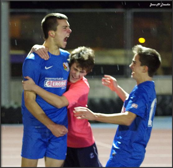 Tenía que llegar y llegó, el partido del que hiciésemos de nuestro campo una fortaleza. El Éibar lo intentó y lo intentó, pero los palos y nuestra defensa, apoyada por todo el equipo, decidieron que hoy no tocaba, que hoy el balón no entraría en nuestra meta. El encuentro era un “ahora yo, ahora tu” sin claras ocasiones hasta que llego el minuto veinte, en el que el Éibar dispuso de dos claras ocasiones seguidas que se cantaron como gol. Dos minutos más tarde, nuestro rival crecido, pega un palo y vuelve a meternos el miedo en el cuerpo, pero solo por un momento. Lejos de amedrentarnos, seguimos haciendo nuestro juego acabando la primera parte 0-0. En la segunda más de lo mismo hasta que llego la oportunidad que no se desperdicio. Era el minuto sesenta y cuatro y Aritz recibe un balón interior, controla bien y encara al portero al que le recorta y dejándole atrás, solo tiene que empujar el balón con el exterior para que este se vaya al fondo de las mallas, 1-0. Con los cambios y jugadores de refresco nuestro juego se hizo más ofensivo. Es en el setenta y tres cuando Gara recibe un pase en el vértice del área y en vez de controlar, golpea de primeras y el balón hace una parábola que pasa por encima del portero, consiguiendo el segundo gol, 2-0. Euforia en los nuestros y caras de incrédulos en el Éibar. Nuestro rival se echó para arriba “a muerte”, quedaba tiempo y quería marcar. Es cuando nos convertimos en una autentica muralla rechazando todos los balones que intentaban atravesarnos. Una y otra vez el Éibar lo intentaba y fracasaba. Pegó un larguero en el minuto ochenta y otro en el noventa y cuatro. Final con una victoria importante, sobre todo para darnos animo. Un aplauso para nuestros chavales por el esfuerzo realizado durante todo el encuentro. De esta forma se consiguen los triunfos y las victorias. La próxima semana nos vamos a Billabona, será la primera vez que jugaremos en el nuevo campo recientemente remodelado. Si jugamos así, nos podemos traer los tres puntos para casa.